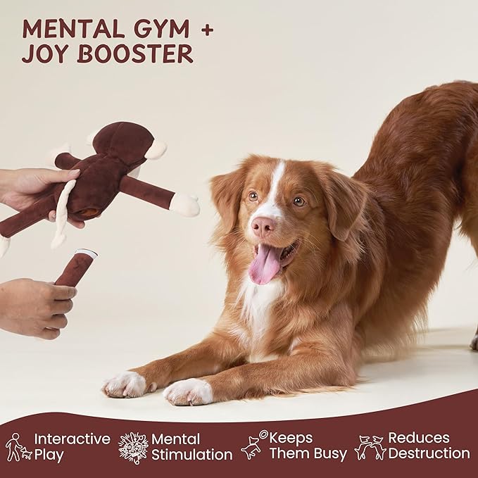 Nocciola Tearable Pull Rip Apart Monkey Dog Toy with Squeaker & Crinkle - Interactive Stuffed Plush Toy to Keep Dogs Busy, Pet Puzzle Enrichment Chew Toys for Small Medium Large Breeds
