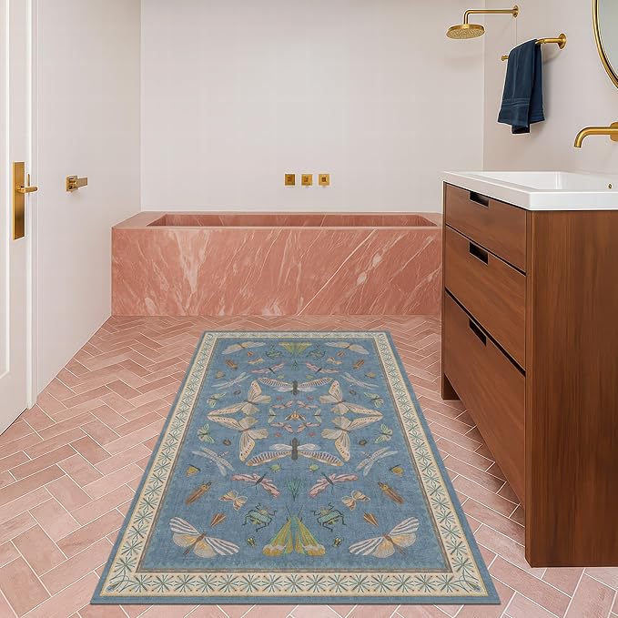 Washable Blue Rugs for Bedroom Bedside - 3x4 Area Rug for Large Kitchen, Entrance Indoor, Boho Insect Print Bug Décor, Non Slip Low Pile Fade Resistant