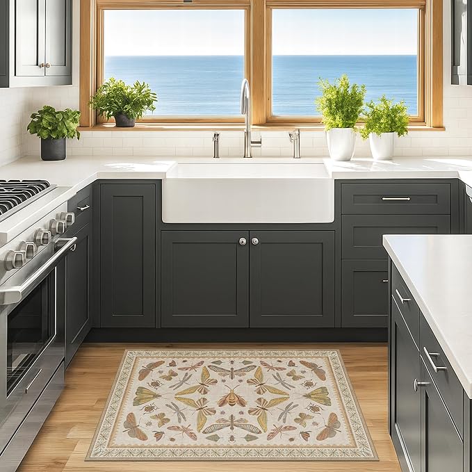 - Whimsical Nature-Inspired Design: Celebrate the wonder of the natural world with this charming insect-themed washable area rug. A neutral beige background provides a soft canvas for an intricate array of butterflies, dragonflies, beetles, and moths—arranged in playful symmetry. The muted tones of sage green, golden mustard, dusty blue, and blush rose lend a vintage botanical feel, while the hand-illustrated look evokes the feel of antique, cottagecore, eclectic entomology prints