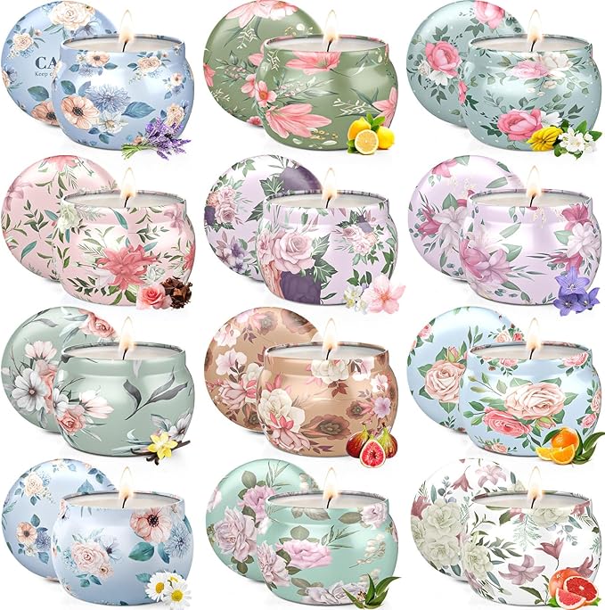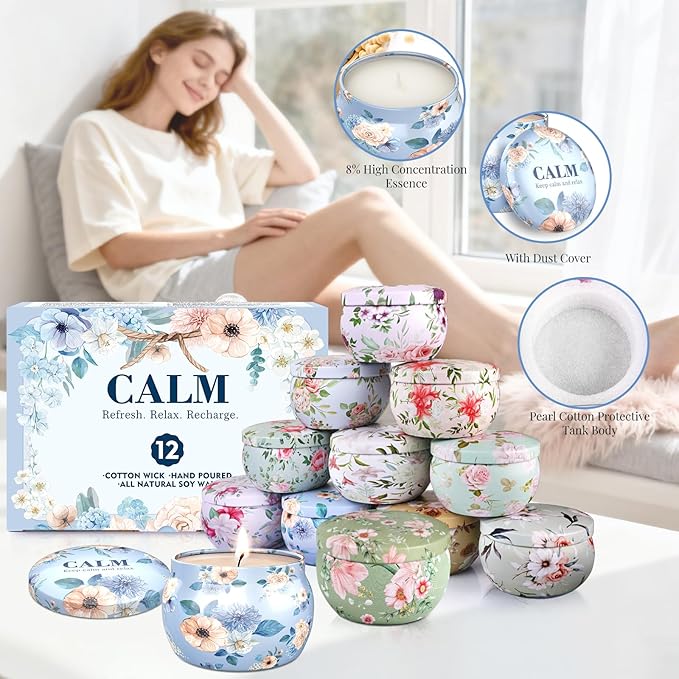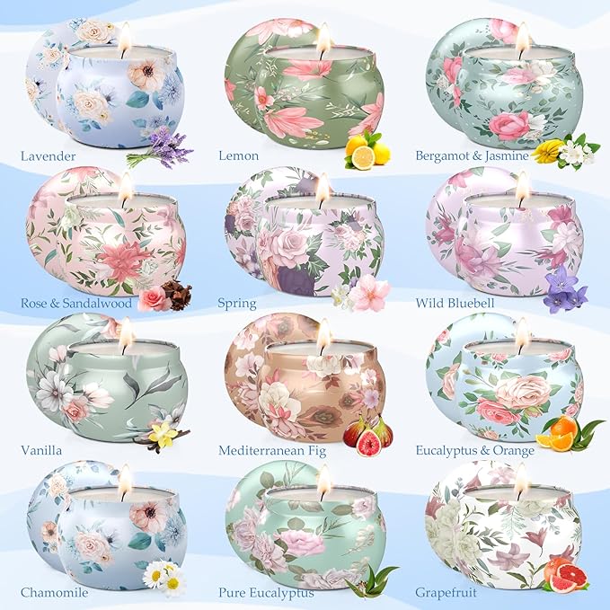 - [12 Different Fragrances] Each set of BlissfulOasis scented candles contains 12 different scents of scented candles: Lavender, Lemon, Eucalyptus & Orange, Rose & Sandalwood, Vanilla and so on. 12 unique fragrances for every mood and moment of you