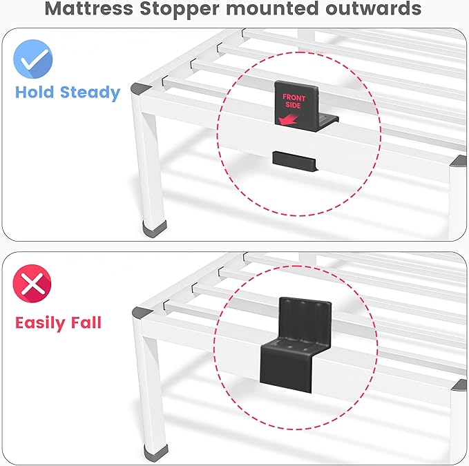 - User-friendly Installation: Upgraded folding slats and leg support design make installation a breeze, saving you valuable time. Moreover, we include four mattress stoppers for added mattress security.