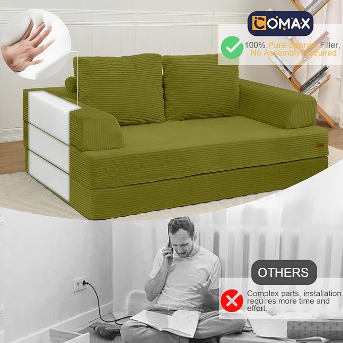 COMAX Convertible Sofa Bed, Folding Floor Couch Corduroy Fold Out Couch Bed Futon Sleeper Mattress with Pillows, Boneless Sofa Comfy Lounge Loveseat for Living Room Bedroom, Light Green