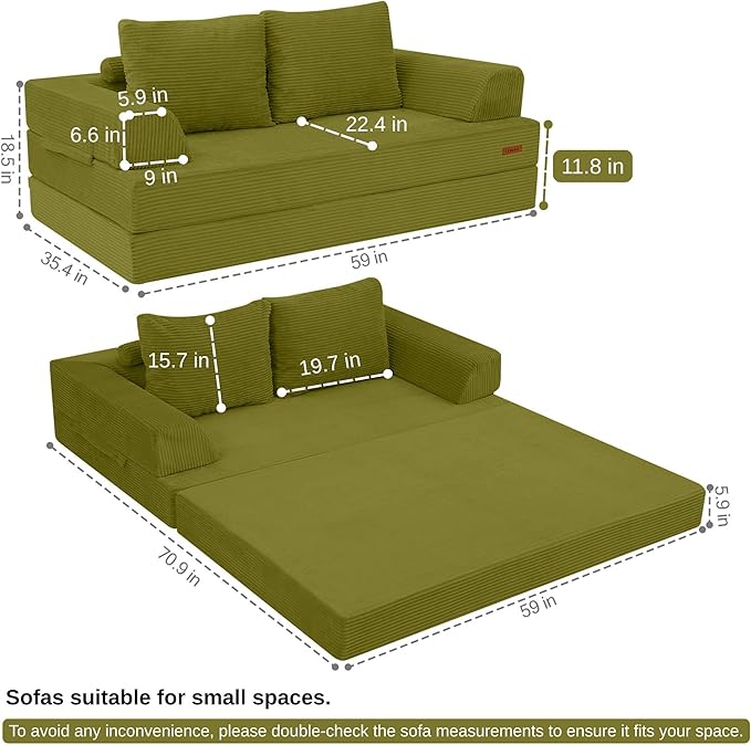 - Ultimate Comfort: Crafted with premium foam filling and two shredded foam pillows, this convertible couch is built for long-lasting comfort. The high-resilience foam cushions gently support your body while the soft corduroy fabric adds a cozy, skin-friendly feel