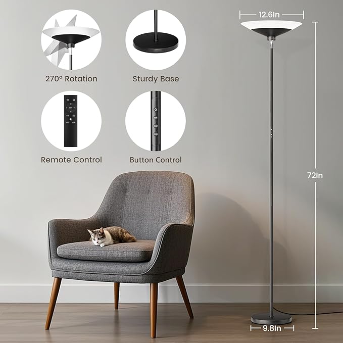 - 【Dual-Zone Lighting】This upgraded torchiere led floor lamp, adjust brightness (10%-100%) and color temperature (3000K-6500K), the warm light creates cozy ambiance for movie nights or relaxation, the natural light provides bright illumination for room area.
