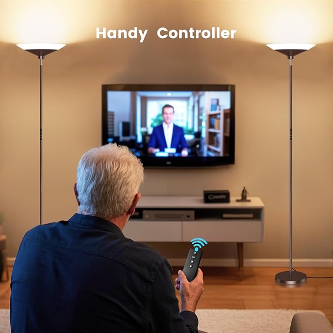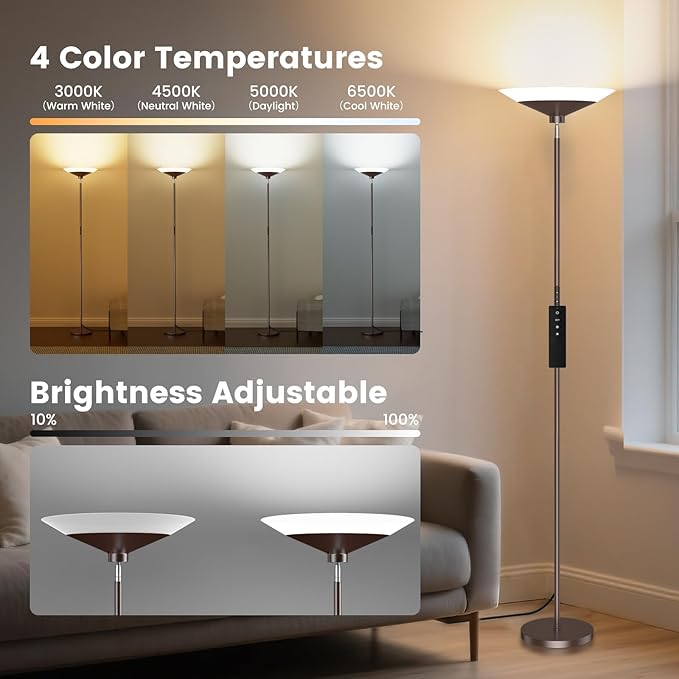 - 【Dual-Zone Lighting】This torchiere led floor lamp, adjust brightness (10%-100%) and color temperature (3000K-6500K), the warm light creates cozy ambiance for movie nights or relaxation, the natural light provides bright illumination for room area.