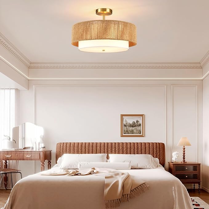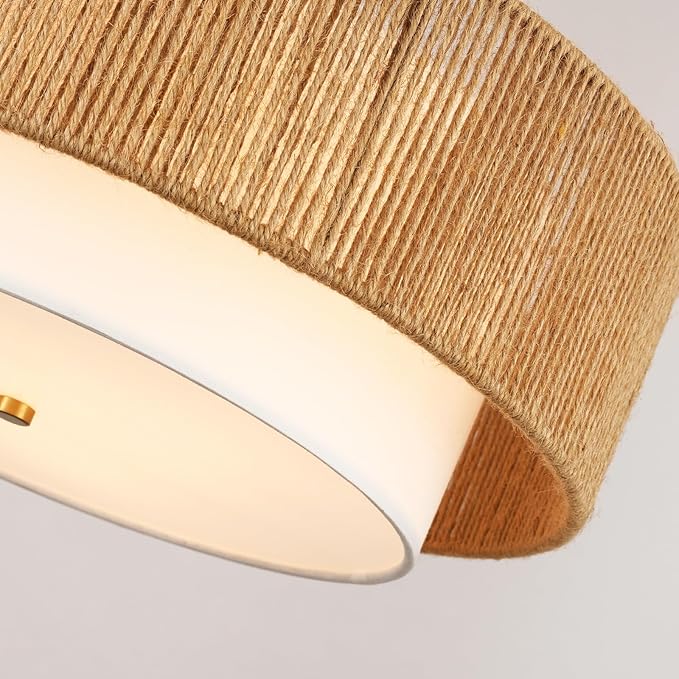 Boho Semi Flush Mount Ceiling Light Rattan Ceiling Light 18" Farmhouse Ceiling Lamp with Natural Hemp Rope Fabric Lampshade for Dining Room Living Room Bedroom Kitchen