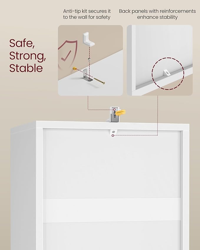 - Long-Lasting and Safe: Built with sturdy materials, each shelf can hold up to 22 lb. The H-shaped structure and slot-in back panels add stability, and the anti-tip kit ensures safety