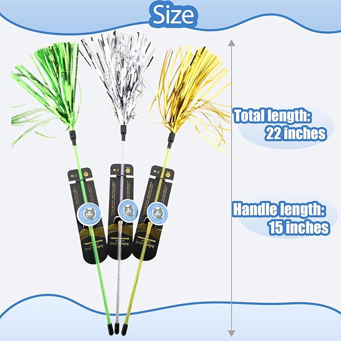 - 【Durable and Engaging Cat Wand Toys】 This 5-pack cat teaser wand is crafted with durable PE material, designed to withstand hours of active play. The lightweight, ergonomic handle makes it easy to use, ensuring fun for both you and your cat. Featuring vibrant metallic tassels, these toys are perfect for stimulating your cat's natural hunting instincts and keeping them entertained. Ideal for daily play, this set encourages exercise, helping your cat stay active and healthy while reducing stress and boredom. Whether you're strengthening your bond with your pet or giving them an outlet for their energy, these wands are a reliable choice for interactive fun.