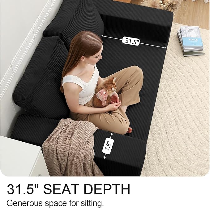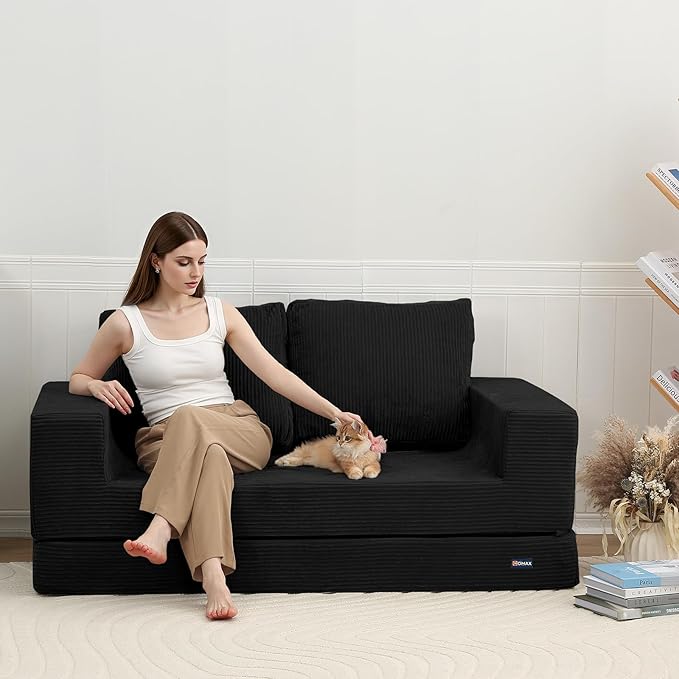 COMAX Convertible Sofa Bed Queen, Folding Fold Out Couch Bed, Floor Futon Couch Corduroy Sleeper Mattress with Back Pillows, Boneless Sofa Comfy Lounge Loveseat for Living Room Bedroom, Black