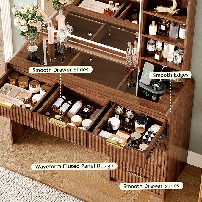 47“Makeup Vanity Desk with Mirror and Lights, Vanity Desk with 7 Drawers & Storage Shelves, Vanity Table with Power Outlet, 3 Color Modes & Adjustable Brightness Dressing Table, Bedroom,Brown