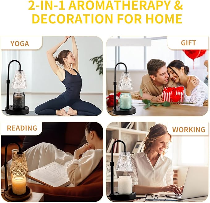 - Fully Dimmable and 12-Hour Timing Function: Enjoy complete control over the ambiance with our dimmable knob, offering unrestricted dimming for personalized melting speeds. Additionally, our Candle+Warmer+Lamp boasts a convenient timer function, ensuring a perfect atmosphere tailored to your preferences, It can help you sleep peacefully.
