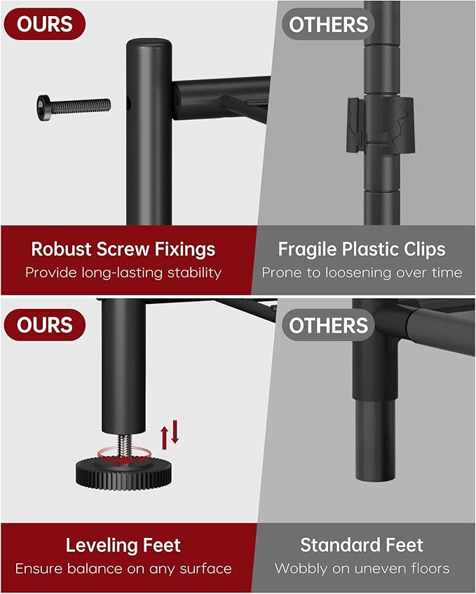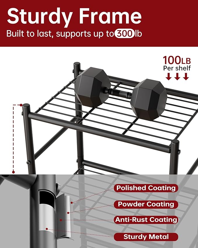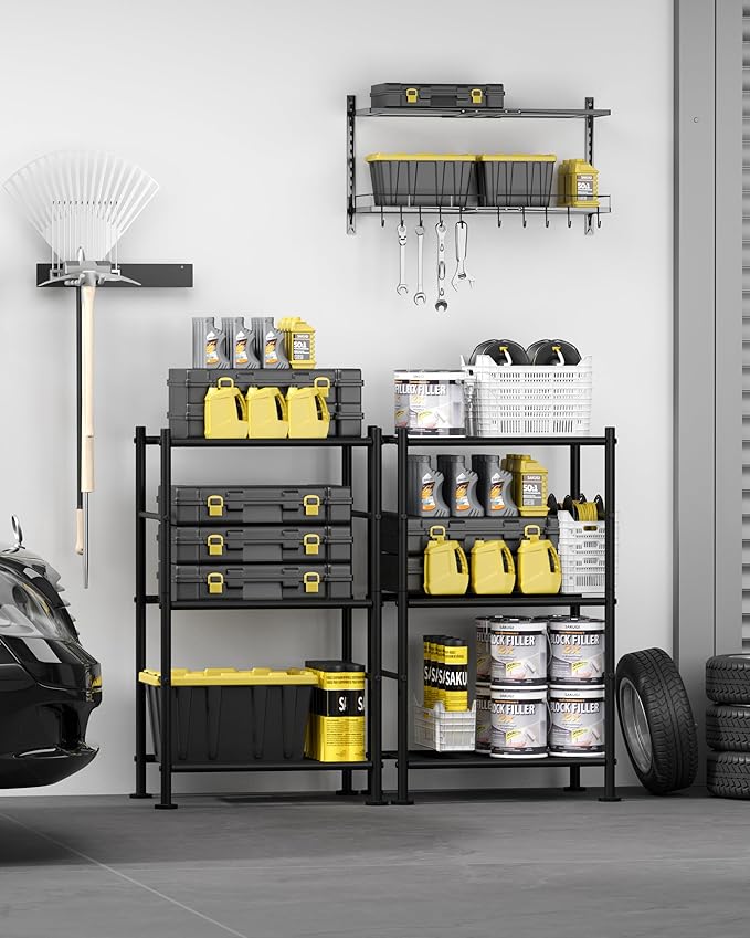 - STRONG & STURDY CONSTRUCTION: Built with thick steel tubes and secured with screws, this metal shelving rack provides excellent load-bearing strength. Adjustable leveling feet keep it balanced on uneven floors, preventing wobbling or tipping. The reinforced frame and side bar deliver long-lasting stability for daily garage storage or household organization.