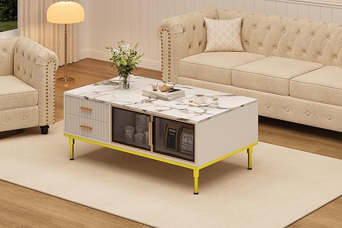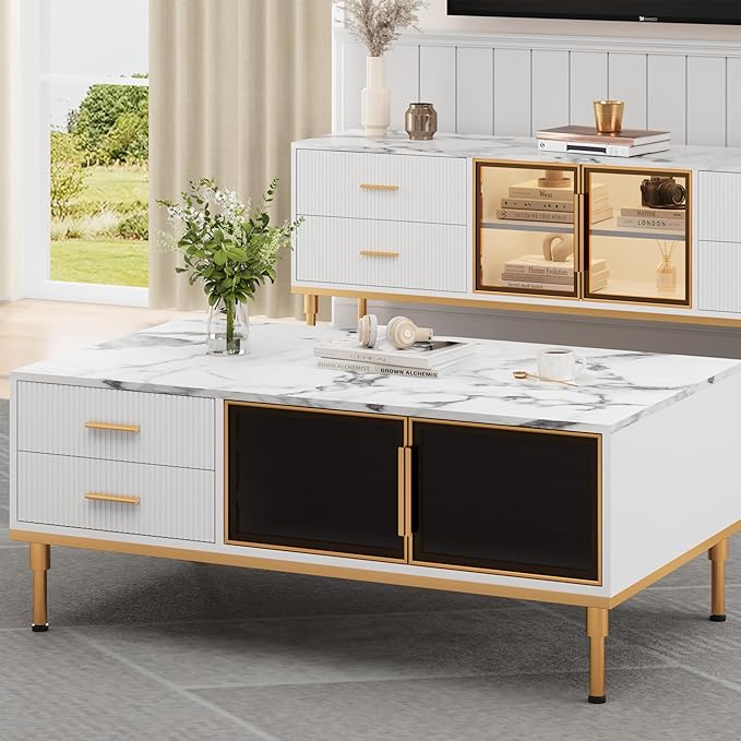 - AMPLE STORAGE – Keep your living room clutter-free with this functional storage coffee table. It includes four smooth-gliding drawers and two glass-door cabinets, ideal for stashing remotes, magazines, books, and more while maintaining a tidy space.