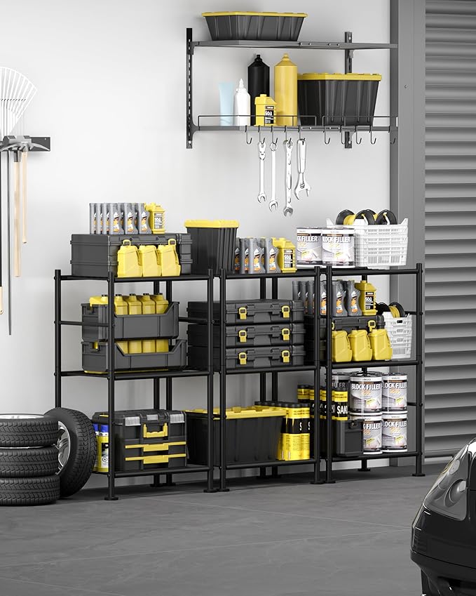 - STRONG & STURDY CONSTRUCTION: Built with thick steel tubes and secured with screws, this metal shelving rack provides excellent load-bearing strength. Adjustable leveling feet keep it balanced on uneven floors, preventing wobbling or tipping. The reinforced frame and side bar deliver long-lasting stability for daily garage storage or household organization.