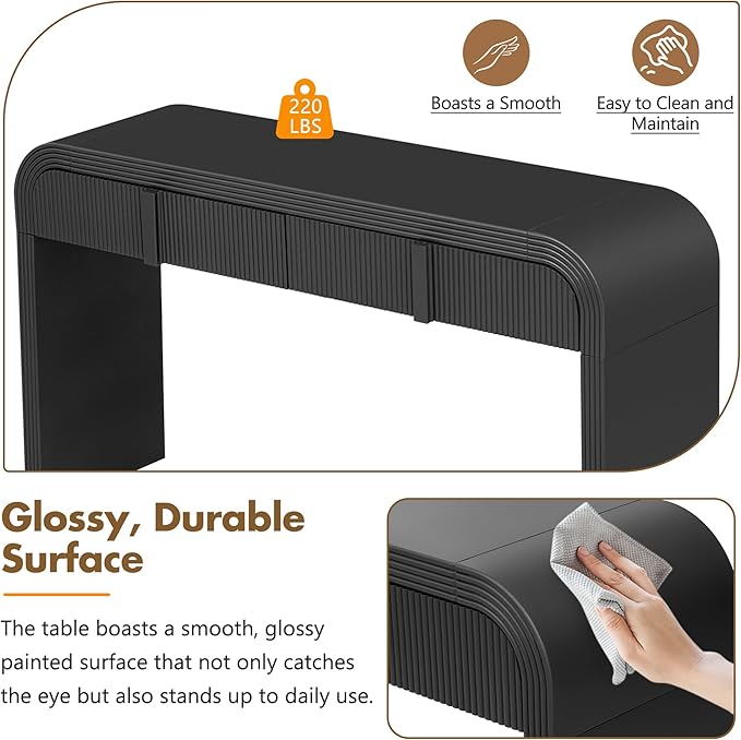 - This sleek console table is well constructed of high quality MDF in glossy finish ensuring its durability and stability for lasting performance. The capacious tabletop can hold up to 220 lbs.