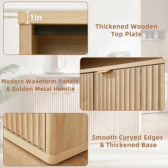 - [Unique Design]Overall dimensions: 15.4"D x 55.2"W x 31.9"H. This large sideboard with curved arc edges features 4 minimalist-style doors with fluted waveform panel, paired with elegant gold metal handles, adding a modern and sophisticated touch to dining rooms and kitchens. The wood-grained surface of the side board infuses your home with the breath of nature.