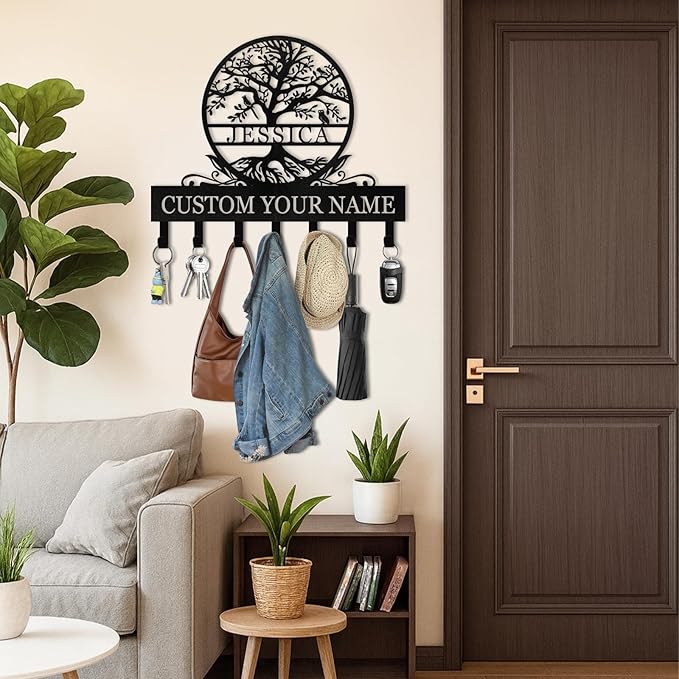 Personalized Metal Key Holder Wall Mount, Custom Name Tree of Life Key Holder for Wall, Key Organizer Rack with Hooks, Home Decor for Living Room Entryway Bathroom Kitchen, Housewarming Gifts Color04