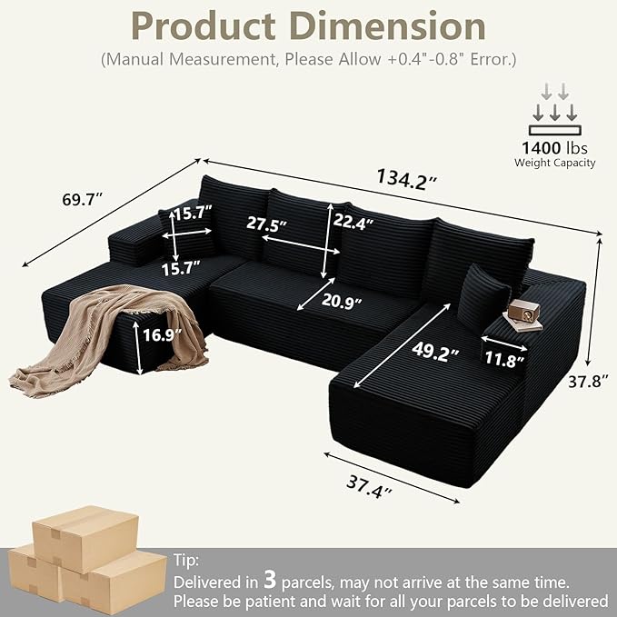- No Assembly Hassles, Ready to Enjoy: Say goodbye to complicated furniture setups! Simply unbox the pieces, lightly tap each section to restore its full, plush shape, and enjoy. The complete revival process may take up to 72 hours. Built with a 400 lbs per seat weight capacity and heavy-duty construction, this sofa is designed for long-lasting durability.