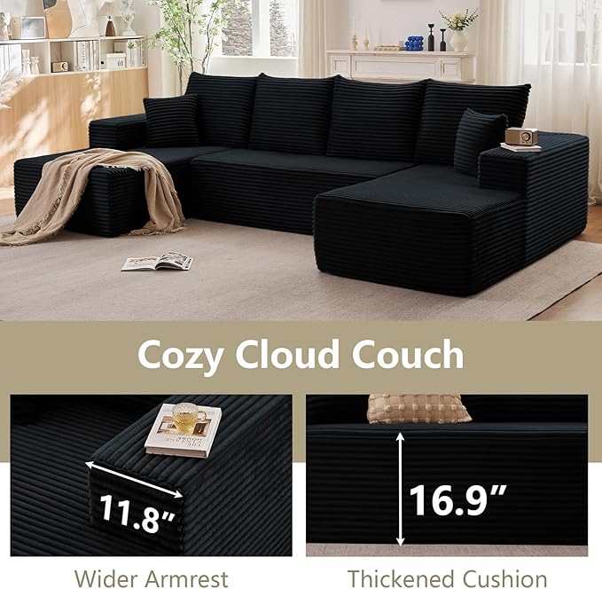 Sectional Cloud Couch for Living Room, Stupendous U Shaped Sofas, Modular Floor Deep-Seat Sofa, Big Comfy Corduroy Couches Set with Fluffy Memory Foam, No Assembly Required, Black
