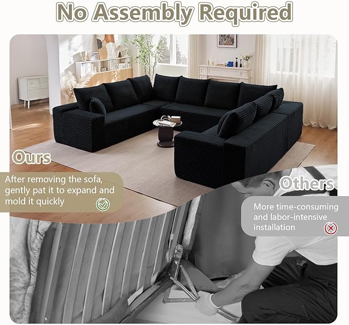 Sectional Cloud Couch for Living Room, Big Comfy Corduroy Couches Set with Fluffy Memory Foam, Modular Floor Deep-Seat Sofa, Stupendous U Shaped Sofas with 12 Pillows, No Assembly Required, Black