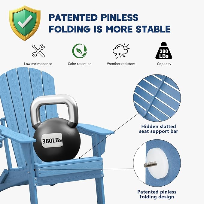Plawdlik Folding Adirondack Chair with Cup Holder,SGS Tested,Heavy All-Weather,Wooden Textured,HDPE Outdoor Chairs for Patio Backyard Fire Pit, Light Blue