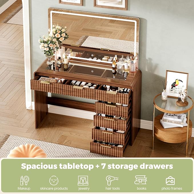 47“Makeup Vanity Desk with 44.8" Mirror and Lights, Vanity Desk with 7 Drawers, Makeup vanity table with a glass tabletop, 3 Color Modes & Adjustable Brightness Dressing Table, Bedroom,Walnut
