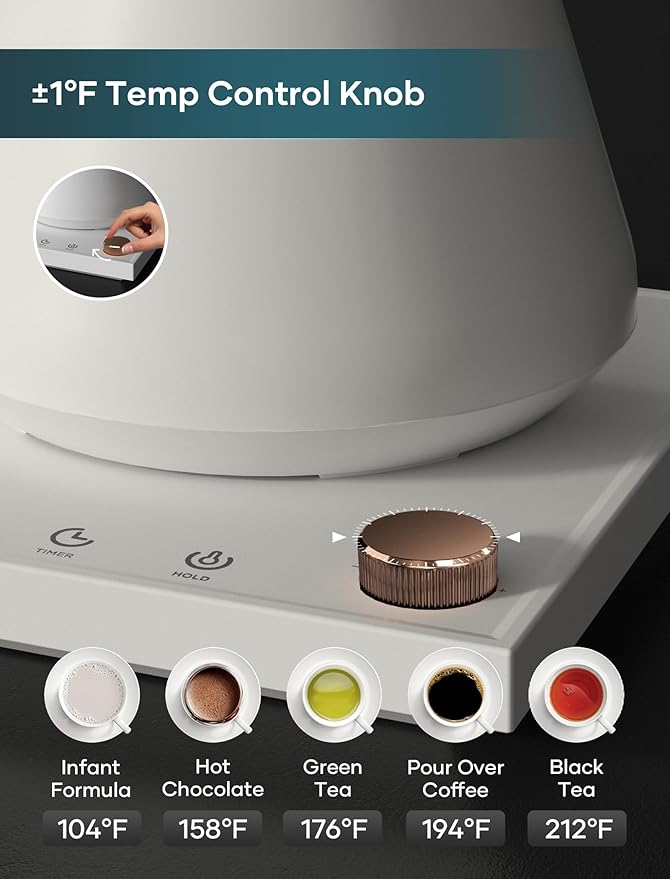 - ±1℉ Precise Temperature Control - The intelligent base of this gooseneck electric kettle auto-adjusts heating power for pinpoint accuracy. From pour-over coffee at 205°F to green tea at 176°F, enjoy barista-quality flavor every time.