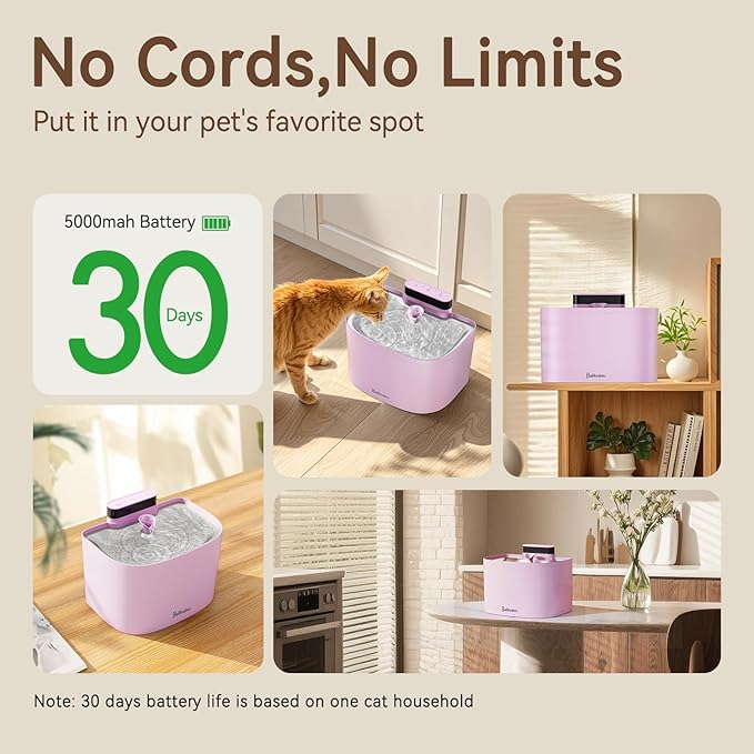 - 【High-capacity battery powered & Pumpless Desgin】Bellkaspet M1 Cat Water Fountain features a built-in 5000mAh rechargeable battery, delivering fresh filtered water for your pet anytime, anywhere. Its innovative pumpless design and charging base are completely cord-free, eliminating stray electrical currents in the water - ensuring safe, comfortable hydration for your furry friends.