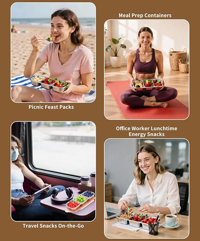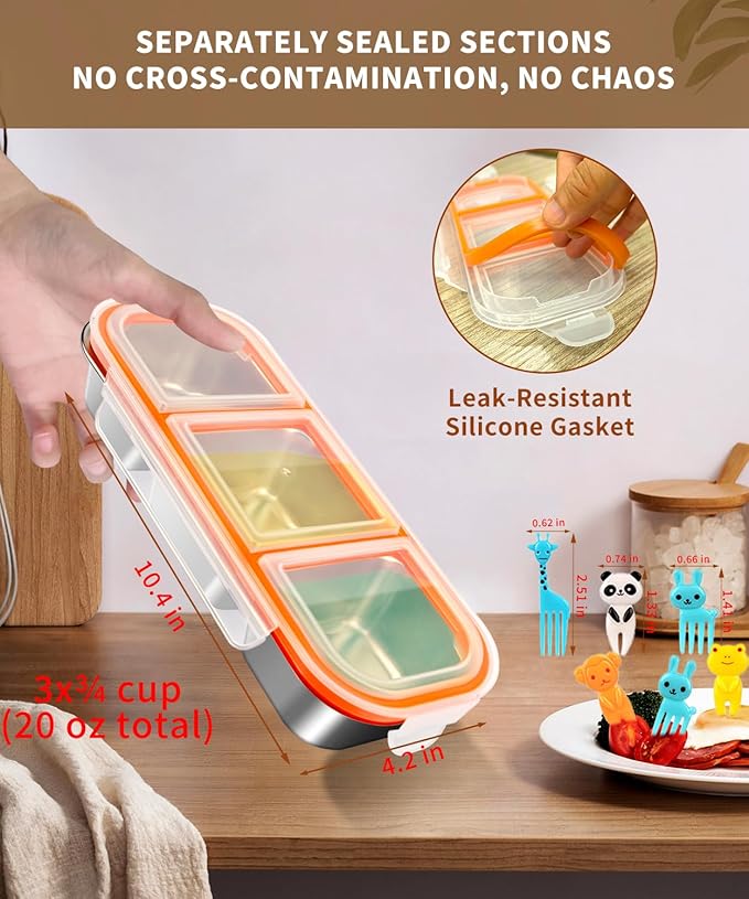 - ๐-๐๐จ๐ฆ๐ฉ๐๐ซ๐ญ๐ฆ๐๐ง๐ญ ๐๐๐ฌ๐ข๐ ๐ง,๐๐จ ๐๐ข๐ฑ๐ข๐ง๐ , ๐๐๐ฌ๐ฒ ๐๐๐ฅ๐๐ง๐๐๐ ๐๐๐๐ฅ๐ฌ:4 Pack stainless steel snack containers with Food Picks Features 3 separate 7oz compartments to keep snacks, fruits, sauces, or yogurt neatly divided. Say goodbye to flavor mixing and messy meals: it simplifies balanced lunch prep (e.g., DIY snack combos, portion control) and locks in freshness, perfect for commutes, hikes,office.