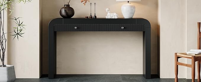 54.3" Curved Console Table with Fluted Drawer, Rustic Entryway Table and Thick Legs, Sturdy Sofa Table for Hallway & Living Room Wood (Black)