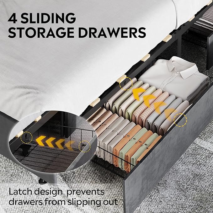 - 【Large Capacity Storage】 Equipped with four hidden drawers (26.9"L × 15.8"W), offering ample space for bedding, accessories, and off-season clothing—saving space and keeping your bedroom tidy. Each drawer is equipped with four smooth-gliding rollers for effortless opening and closing, while the locking mechanism prevents the drawer from sliding out.