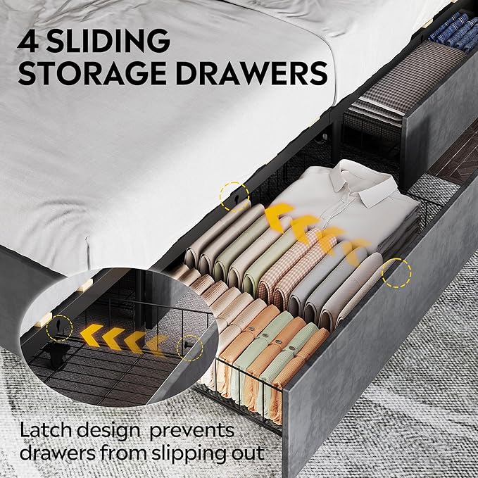 - 【Large Capacity Storage】 Equipped with four hidden drawers (26.9"L × 15.8"W), offering ample space for bedding, accessories, and off-season clothing—saving space and keeping your bedroom tidy. Each drawer is equipped with four smooth-gliding rollers for effortless opening and closing, while the locking mechanism prevents the drawer from sliding out.