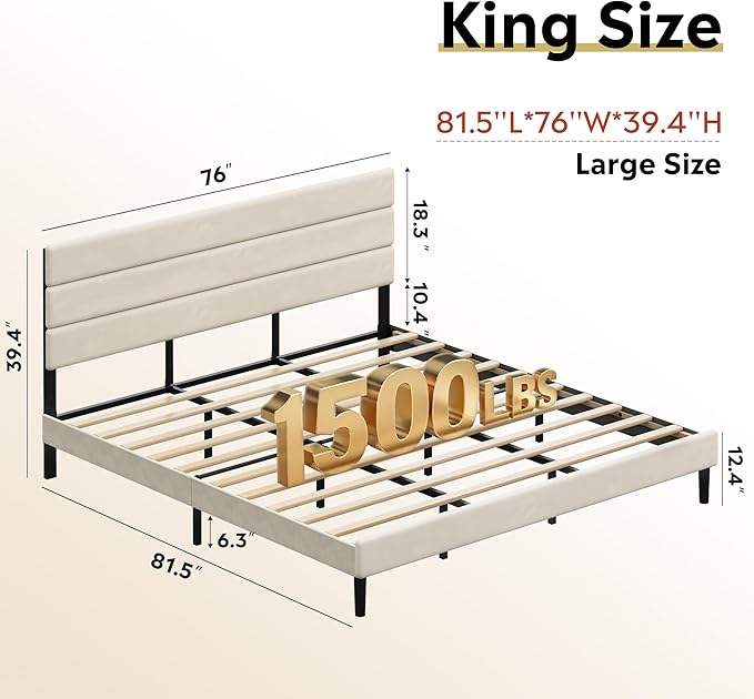 WLIVE King Size Upholstered Bed Frame, Velvet Square Tufted Headboard, Sturdy Metal & Wooden Slats Support, No Box Spring Needed, Beige