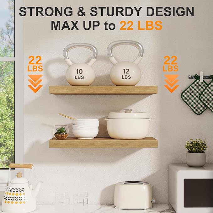 Floating Shelves for Wall, 22.5"W x 8"D Wall Shelf, Rustic Wood Floating Shelf 22.5 Inch Long, Bathroom Shelves Set of 2, 8 Inch Deep Floating Shelves for Living Room, Bedroom, Kitchen, Oak Color
