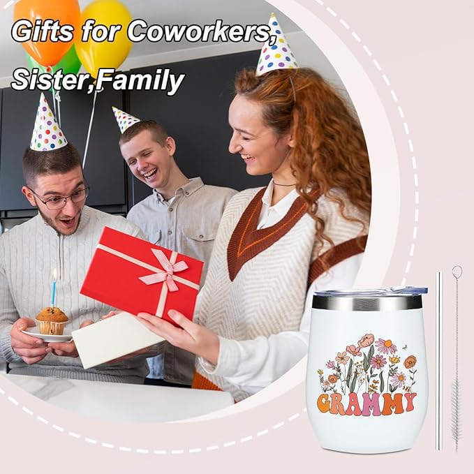 Grammy Grandma Birthday Gifts Wine Tumbler 12 oz Insulated Wine Glass Cup with Lid Straw Vacuum Insulated Travel Cup, Grandma Gifts from Granddaughter for Women Grandmother Christmas Mothers Day