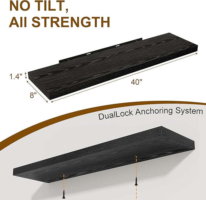 Fun Memories 40 Inch Floating Shelves Set of 2, 8 Inch Deep Wall Shelf, Rustic Wood Storage Shelves for Bedroom, Kitchen, Bathroom, Wall-Mounted Shelf with Invisible Brackets for Books|Storage Black