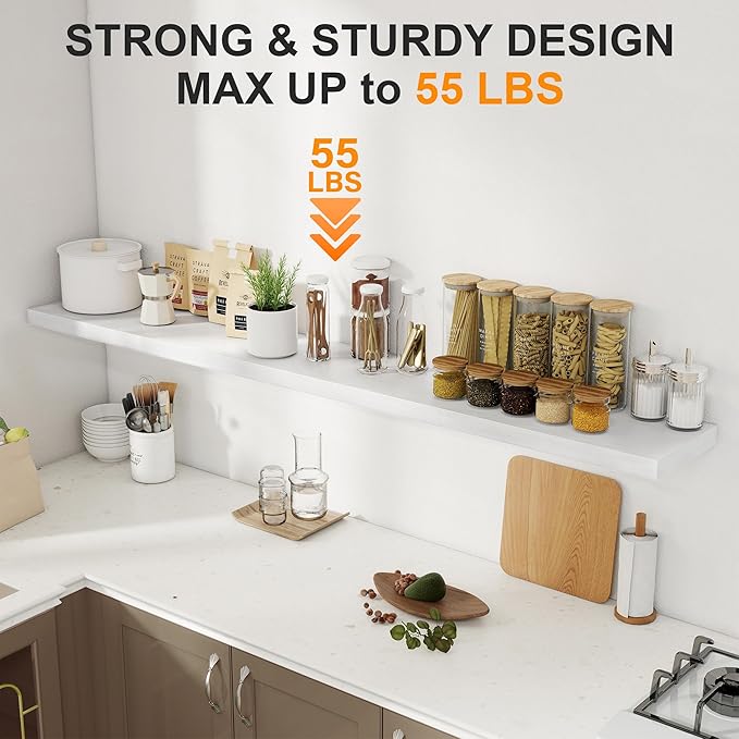 - 【DECORATIVE & FUNCTIONAL】The wall-mounted floating shelves are designed for decoration and storage, utilizing and decorating any space in your home. Used as shelf decor to show your collection, books, or prize, the hanging shelves are perfect for displaying your photo frame, small plants, model, or audio in your living room, office, study. And can also use as over the toilet storage shelf in the bathroom to hold toiletries or used as kitchen shelf to storage condiments.