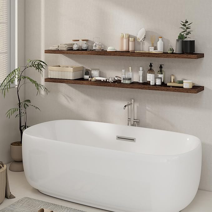 - 【DECORATIVE & FUNCTIONAL】The wall-mounted floating shelves are designed for decoration and storage, utilizing and decorating any space in your home. Used as shelf decor to show your collection, books, or prize, the hanging shelves are perfect for displaying your photo frame, small plants, model, or audio in your living room, office, study. And can also use as over the toilet storage shelf in the bathroom to hold toiletries or used as kitchen shelf to storage condiments.
