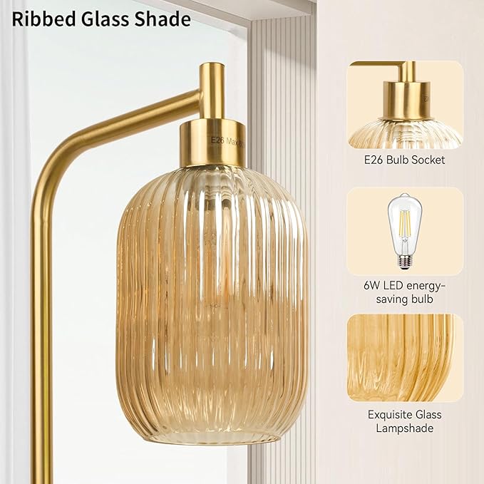 Glass Floor Lamp for Living Room, Dimmer Standing Lamp with Green Ribbed Lampshade,66” Tall Lamp & Gold Floor Lamp for Bedroom Study Room,Brushed Gold (Amber)