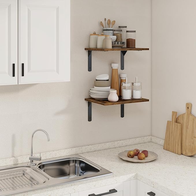 - 【FARMHOUSE RUSTIC FLOATING SHELF】These floating shelves are made of premium engineered wood board and visible triangular bracket. The rustic wooden grain surface add character and warmth to any modern or traditional interior with these deep floating shelves, contrast shelves at staggering heights on the wall or mount side-by-side or in the corner for a clean streamlined look.