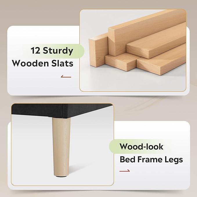 - 【Sturdy & Noise-Free Structure】 Heavy-duty metal frame paired with 12 thickened solid wood slats provides even support, prevents sagging, supports up to 1500 lbs, and ensures a quiet, squeak-free sleep.