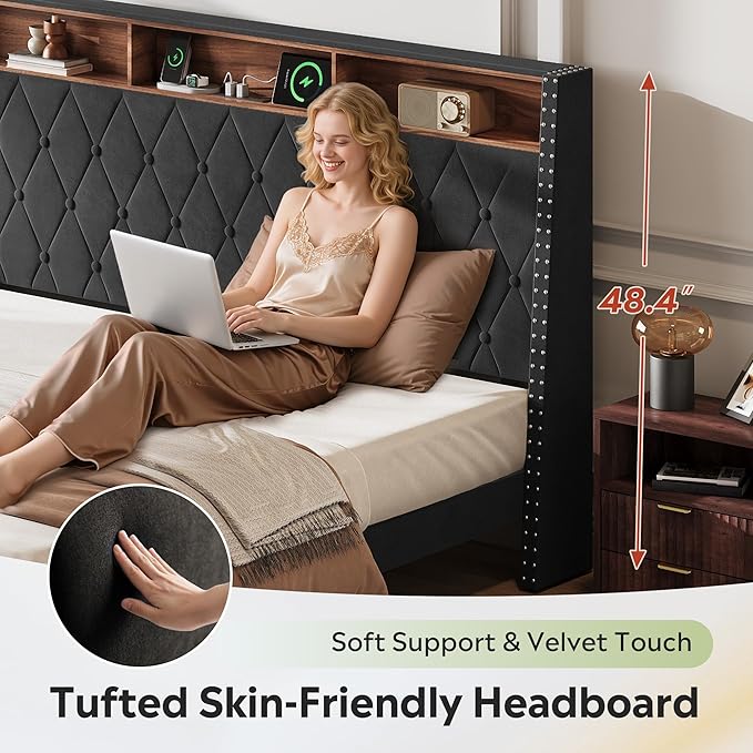 - 【Headboard Storage Shelf with Multi-Port Charging】 The headboard features a single storage shelf perfect for glasses, phones, and remotes. It comes equipped with 2 USB ports and 2 AC outlets allowing convenient fast charging of multiple devices.