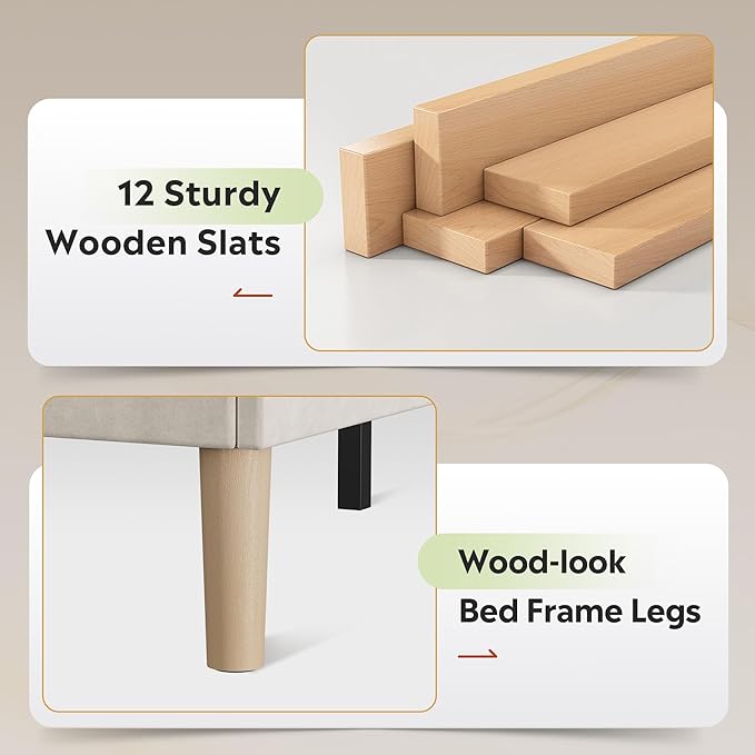 - 【Premium Elegant Upholstered Design】 Upholstered in premium velvet fabric with high-density foam padding for a soft, comfortable feel; tufted headboard design adds a touch of elegance to any bedroom. Features faux wood bed frame legs with a realistic wood-grain finish, blending seamlessly with any room.