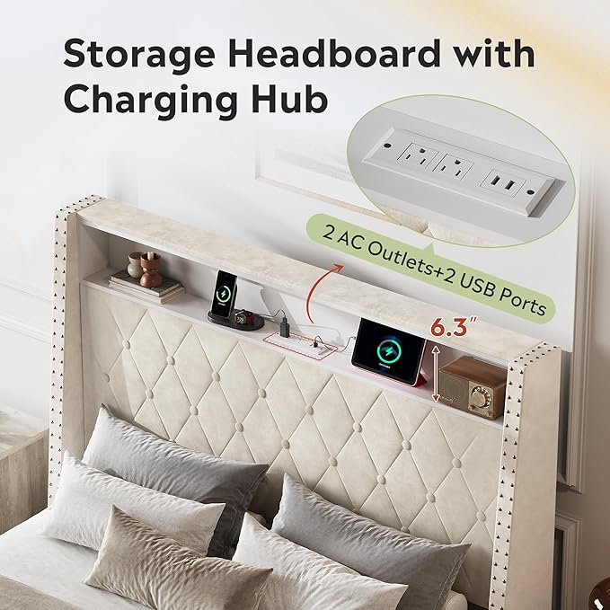 - 【Headboard Storage Shelf with Multi-Port Charging】 The headboard features a single storage shelf perfect for glasses, phones, and remotes. It comes equipped with 2 USB ports and 2 AC outlets allowing convenient fast charging of multiple devices.