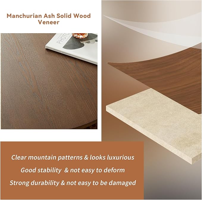 - [Sturdy Wooden Material] The overall frame material of this round top coffee table is made of thickened MDF, and the surface is covered with Manchurian Ash wood veneer and the surface paint spraying process and the large mountain wood grain make the tabletop look very beautiful. The vertical groove stripes around the coffee table are decorated with rubber wood strips, and each one is manually nailed by workers to ensure the beauty of each coffee table.