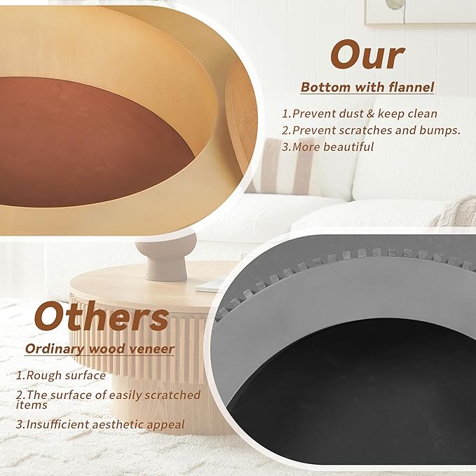 - [Double Round Design] This modern coffee table has a double round design. The rounded design enhances safety to a certain extent.The table is surrounded by hand-pasted rubber wooden strips for decoration, which conforms to the current popular trend of striped coffee tables. The interior hidden space is surrounded by flannel, which can protect the items you place inside from being scratched.