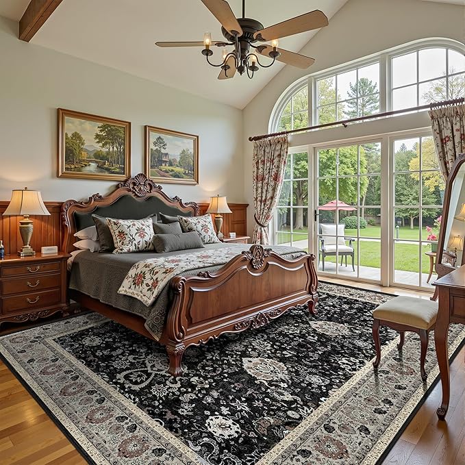 Blcak 8x10 Vintage Rugs for Living Room, Washable Rugs Non Slip Large Area Rug for Bedroom Dining Room Office, Floor Decoration Big Rug Carpet Low-Pile Kid & Pet Friendly(Blcak Navy Multi