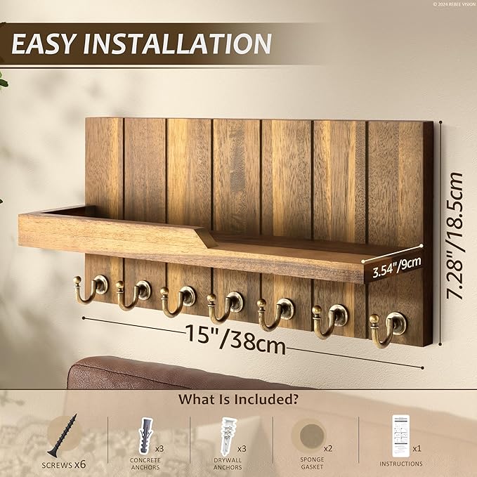 - [STURDY ACACIA WOOD] This keys holder on wall is built to acacia wood. Acacia wood is known for sturdy, ensuring your wall hooks remain sturdy for years of daily use. The natural elegance of this material enhance its value as both a decorative wall shelf. Perfect for anyone looking to combine strength and a touch of living room wall decor charm.