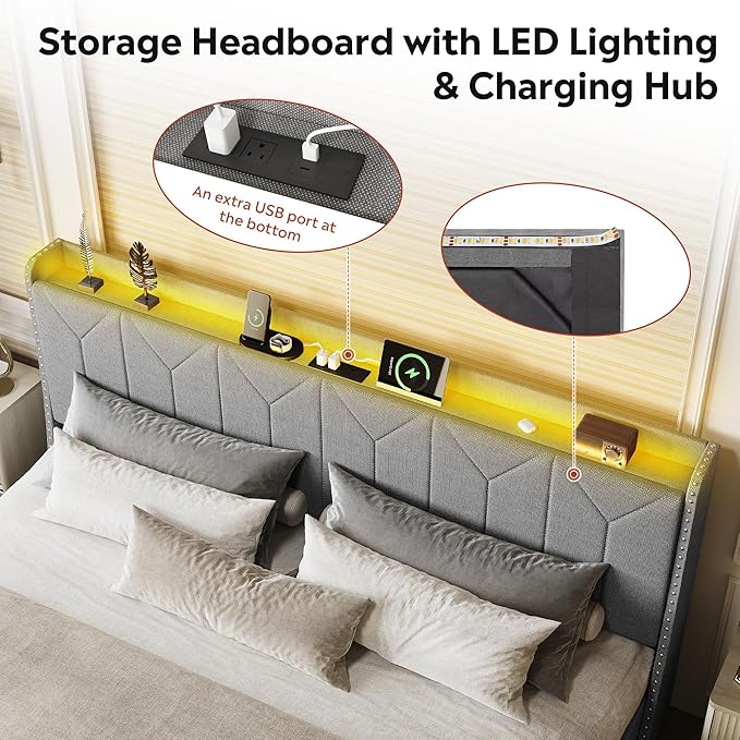- 【Headboard Storage Shelf with Multi-Port Charging】 The headboard features a single storage shelf perfect for glasses, phones, and remotes. It comes equipped with 2 USB ports, 1 Type-C ports and 2 AC outlets allowing convenient fast charging of multiple devices.