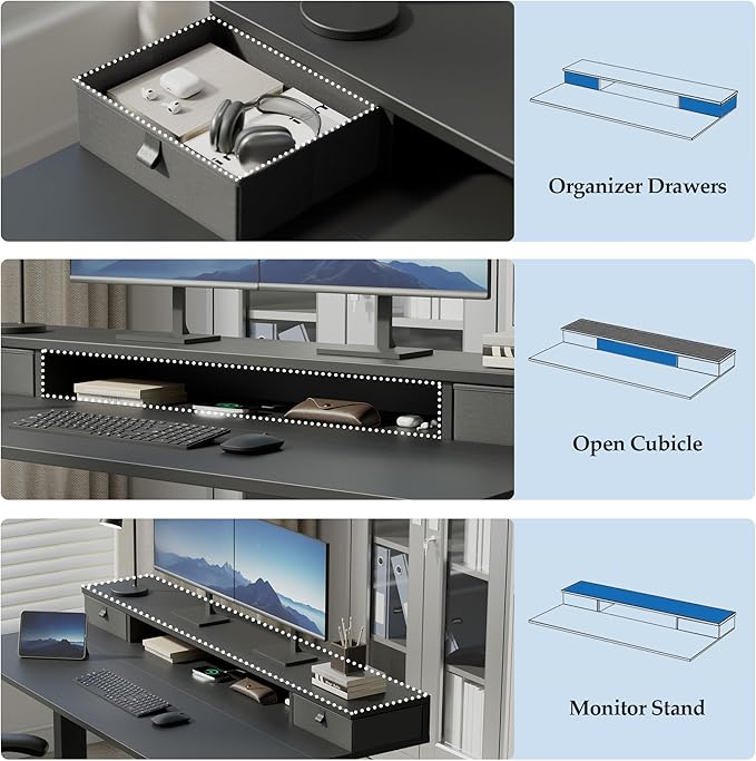 - [Stay Organized, Stay Focused] Large desktop offers ample room for monitors, laptops, and accessories. Two fabric drawers help organize your essentials, keeping your workspace clean and clutter-free.